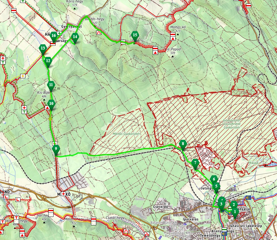 Útvonal: Veszprém Kossuth laktanya, Jutas vitéz kilátó, Jutas ejtőernyős emlékmű, Lőtér hadiút, Márkó-Hárskút főút mentén, Esztergáli –forrás, Papod-tető(644m) Vitéz Bertalan Árpád kilátó, Borzás-hegy, Hárskút